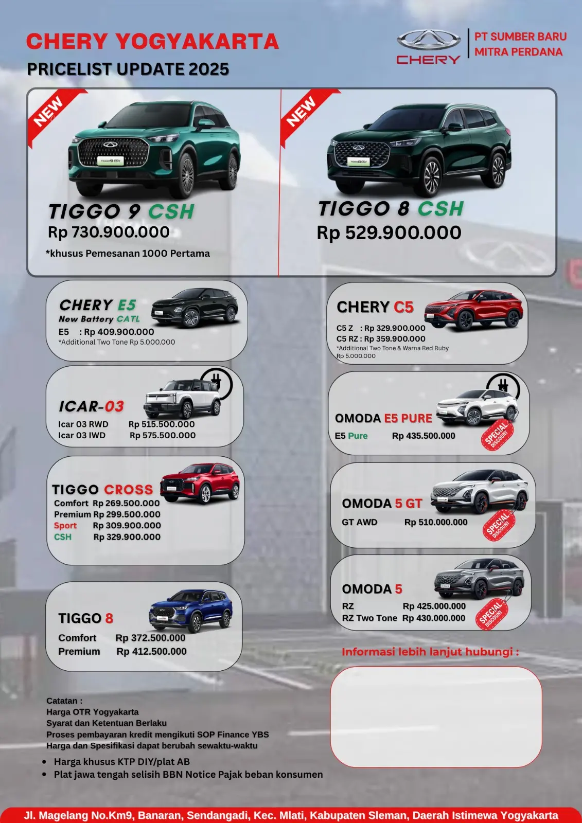 Dapatkan paket diskon dan promo terbaik bulan ini, setiap pembelian mobil di Chery Jogjakarta dengan S&K yang berlaku.
